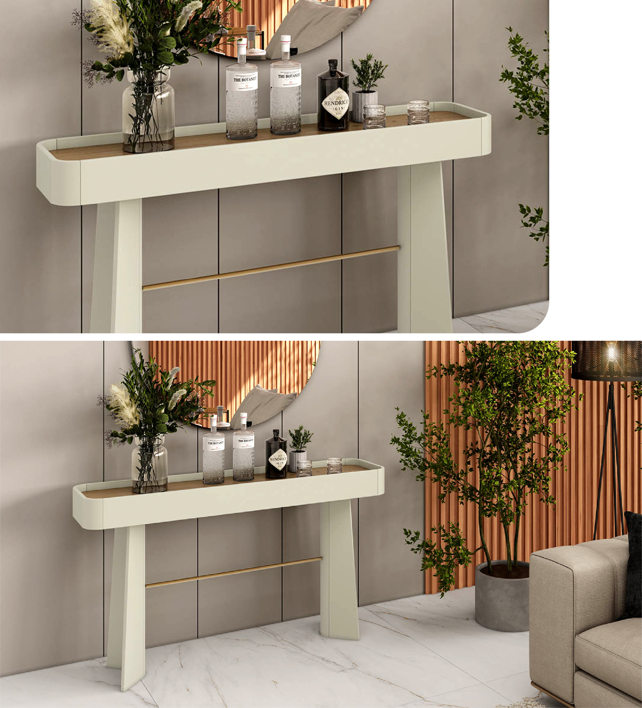 O aparador é uma peça que exala sofisticação através de seu design pensado em cada detalhe. Seu tampo em formato de bandeja, com bordas elevadas, cria uma sensação de aconchego e funcionalidade. Os cantos arredondados acrescentam suavidade à estrutura, enquanto os pés curvos, adornados com um delicado detalhe em metal, conferem um toque de modernidade e leveza.