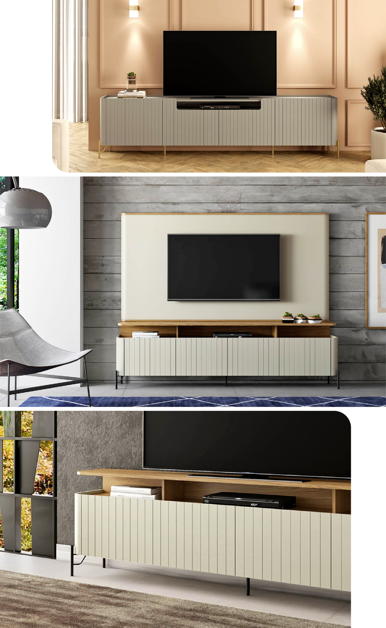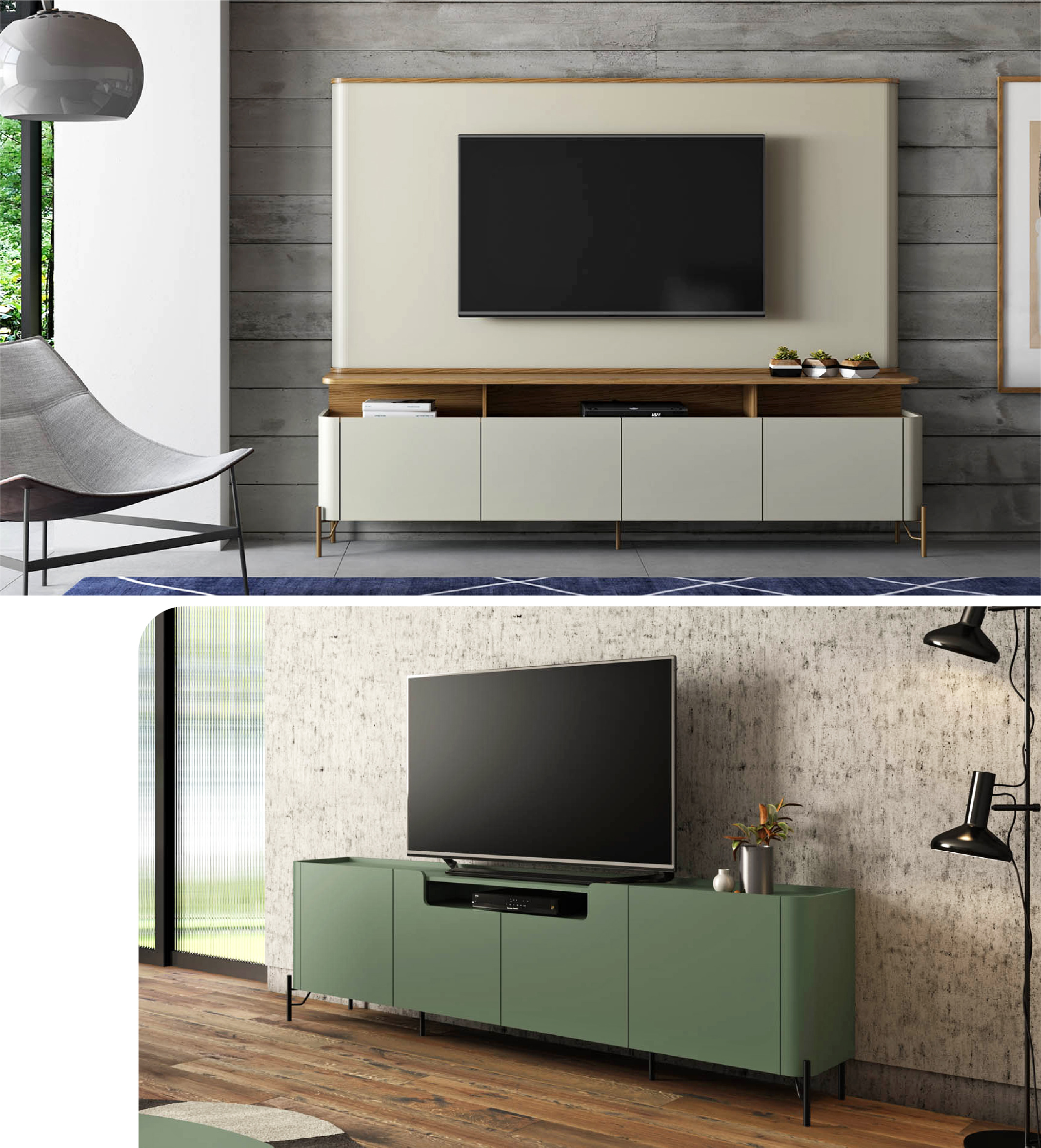 Com frentes lisas que ressaltam seu design puro e sofisticado, o rack Bend, assim como o New Bend — que incorpora recortes nas portas, adicionando um detalhe visual intrigante — torna-se uma peça central perfeita para ambientes contemporâneos. Suas linhas simples unem estética refinada e funcionalidade discreta, criando um equilíbrio harmonioso entre forma e função.