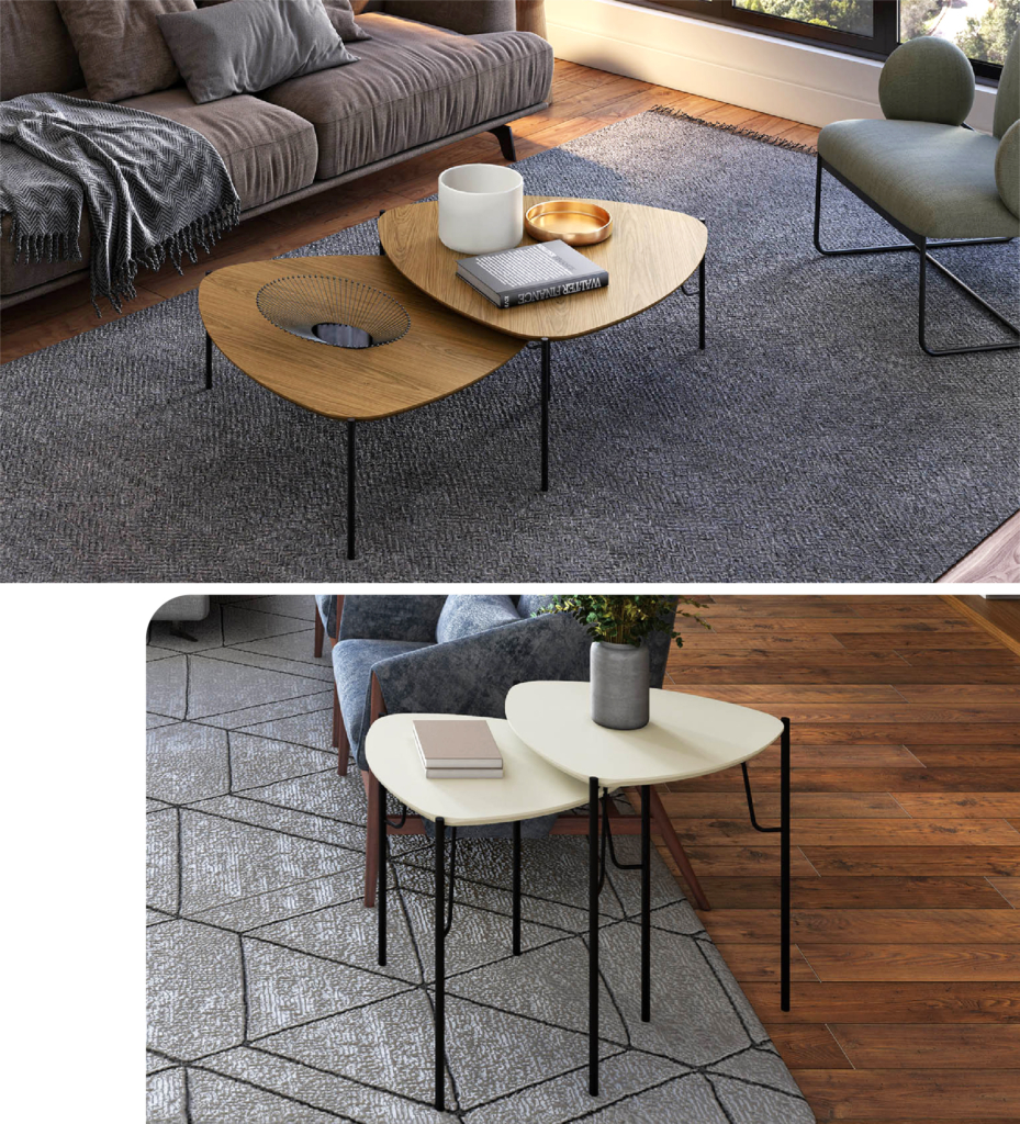 As mesas de centro e laterais, em formato triangular, acrescentam uma dimensão geométrica que desafia o convencional, trazendo dinamismo ao espaço. Bend é uma celebração do equilíbrio entre o tradicional e o moderno, ideal para ambientes que exigem personalidade e sofisticação.